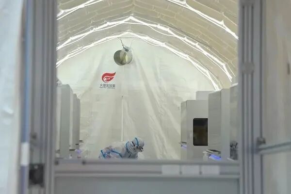 “应检尽检、愿检尽检”北京核酸检测全面铺开后,对检测效率和能力提出了更高的要求,已启动战时机制的北京大兴区政府迅速反应,6月20日中午,中建八局西南公司庞各庄项目接到搭建火眼实验室紧急通知,几十名工友第一时间奔赴大兴区体育中心开工建设。22日清晨,篮球场内3组气膜式核酸检测实验室共计9座气膜仓建成,并于当天完成了设备安装、调试并启动试运营,6月23日正式投入运营。
