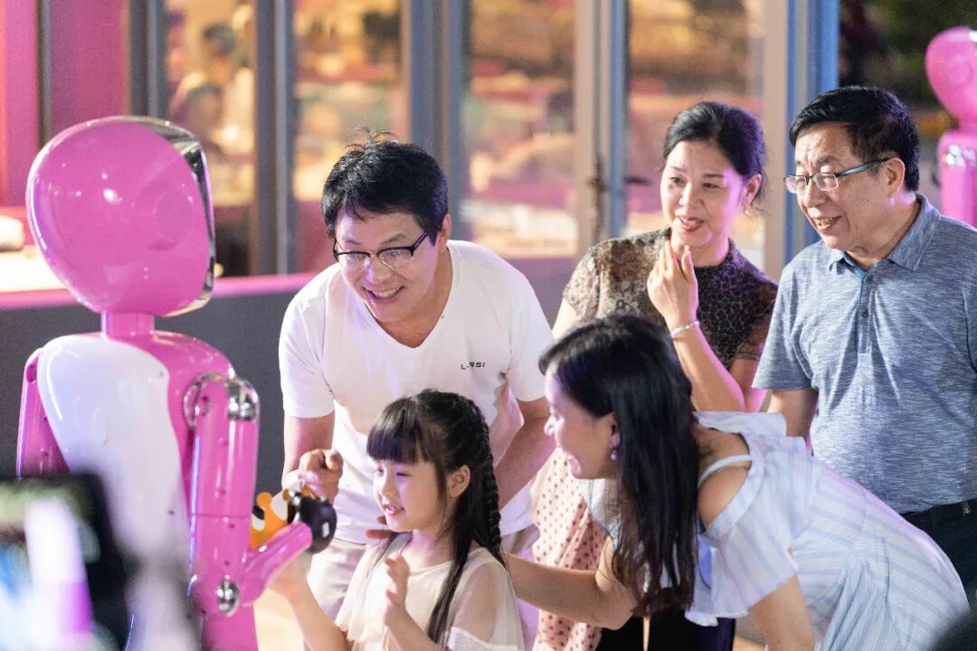 ▲ 6月22日,天降美食王国机器人餐厅开业,嘉宾参观展出的机器人