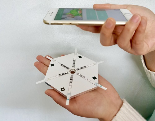 曹振继续演示:试纸条放进样品溶液,5分钟左右反应稳定;把试纸条拿出,放在试纸条搭载托盘上,用手机拍照,小程序会自动识别试纸条上的条形码,读取到底是什么农药、智能判定其残留量的相对多少(半定量)、超不超标等详细信息;还可实时上传数据分享,收集大数据,监测、判断食品安全实时状况。