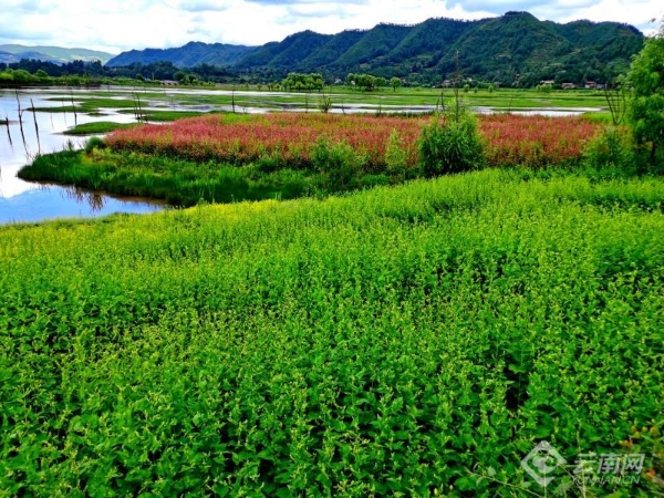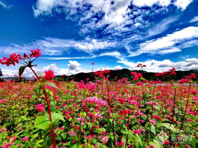 Red buckwheat flower booming at Nianhu lake of Huize attracts visitors