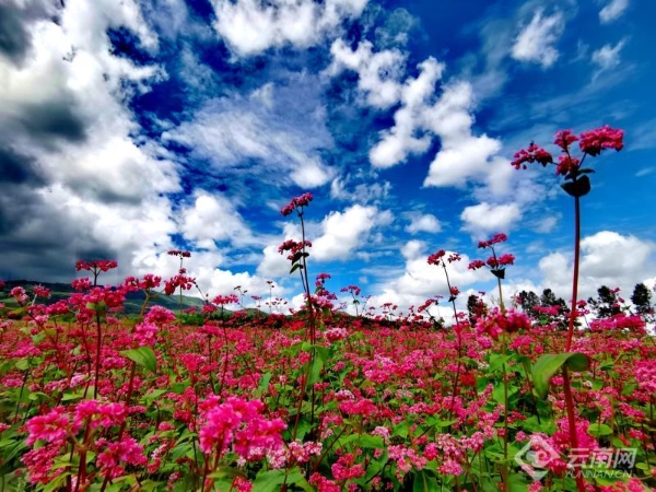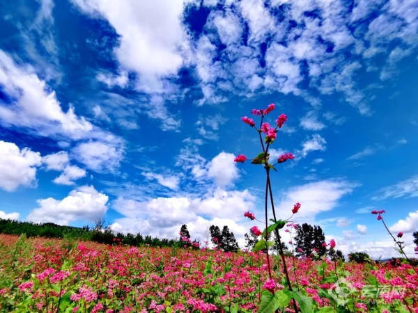 蓝天白云下的曲靖会泽念湖黑颈鹤国家级自然保护区,大片的红色荞花湖畔怒放,为云贵高原的夏天织就一道独特的美景。