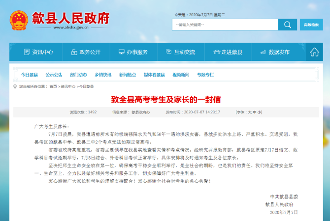 安徽歙县高考语文、数学延期举行