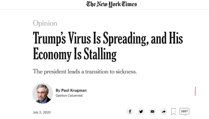 彭斯发表《新冠疫情不会有“第二波”》一文已经过去两周,美国的疫情并没有如白宫预判的那样保持“稳定”,反而迎来了新的高峰。克鲁格曼认为,这种情况在白宫不顾疫情蔓延、执意重启经济时就已经注定。