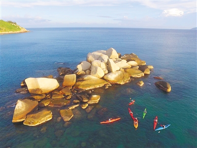皮划艇玩家在万宁加井岛附近海域划艇。