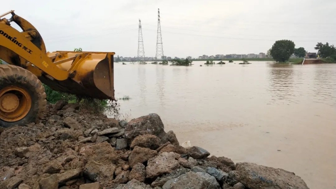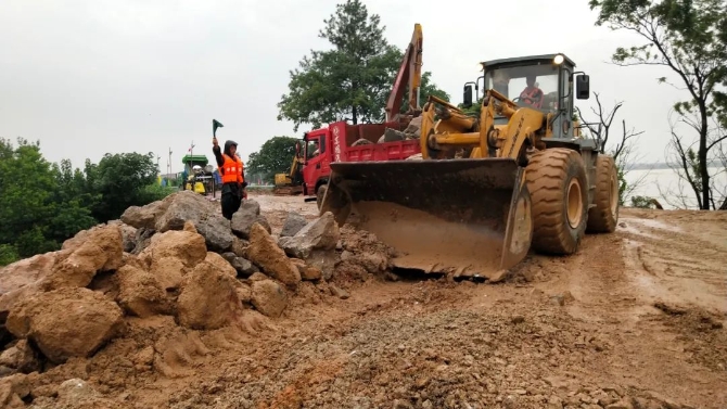 现场不断有运输车将石块等物料倒入漫决口,旁边的挖掘机随即开始平整。