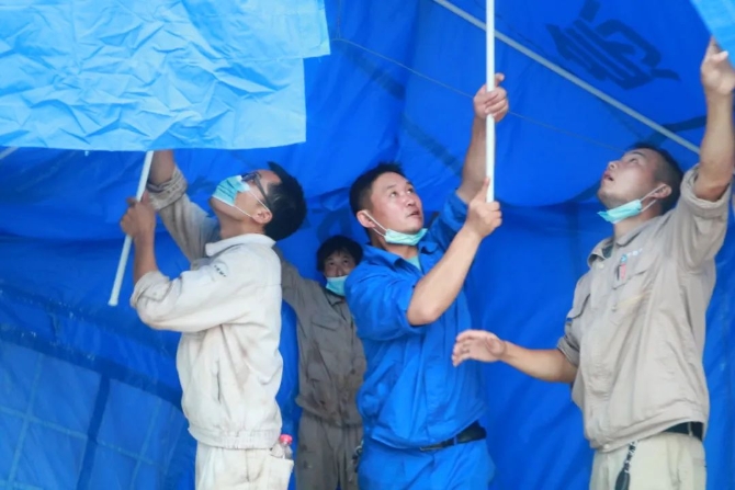 下午5点至凌晨1点,8个小时,近400顶帐篷,2500米建设线已在消泗乡铺设完毕 。