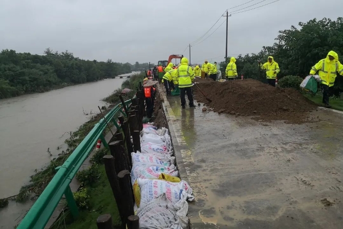 富阳区7月7日启动二级防汛响应后,浙江交工集团江南新城指挥部和大盘山项目出动350名一线施工及管理人员,在15名党员带领下奔赴富春江沿线,接下一天内装填3万个共15万公斤沙袋的“军令状”,并将装好的沙袋运往富春江边,筑起防洪堤坝。(金许斌 王云从 吴霞)
