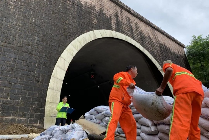 7月8日,安徽公路养护工人在株岭隧道上行线入口开展沙袋加固、护栏修复、土石方清理等救灾工作。孙杰 摄