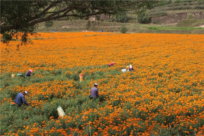 这闯的第一“关”,就是实现种植业的转型。每亩地种植青贮玉米纯收入是三四百元的利润,可是听说种万寿菊亩均收益八九百呢。种万寿菊可不是好玩的,别人种赚钱,咱们这些“生瓜蛋”种说不准还得赔钱!面对七嘴八牙的说法,乡党委决定关口村第一步还是要尝试种万寿菊。咱们不行,就找“成手”来种!于是,关口村引进一家万寿菊专业加工企业,流转村里1800亩土地,2017年种植1400亩青贮玉米、400亩万寿菊;2018年种植1200亩青贮玉米、600亩万寿菊。到年底,除了每亩按100元支付土地流转费用,建档立卡户六个月在公司打工(青贮玉米),户均收入超过1万元,万寿菊采摘期两个月公司支付农户劳务费就高达12万,关口村2017年收益为34万,2018年为43万。