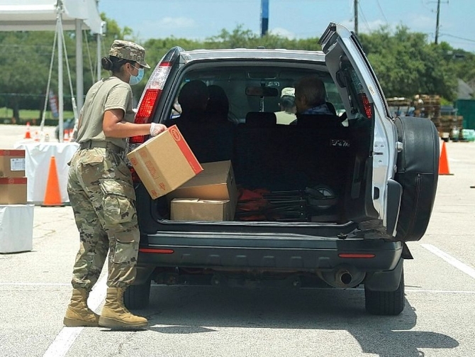 7月11日,在美国得克萨斯州休斯敦市,“食品银行”工作人员将食物放入车辆后备厢。新华社发(劳承跃摄)