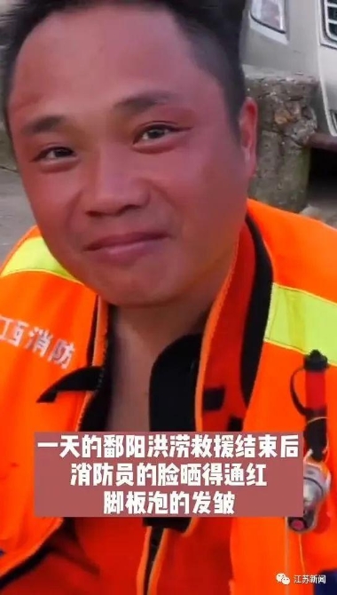 心疼!抗洪消防员晒红的脸和泡皱的脚