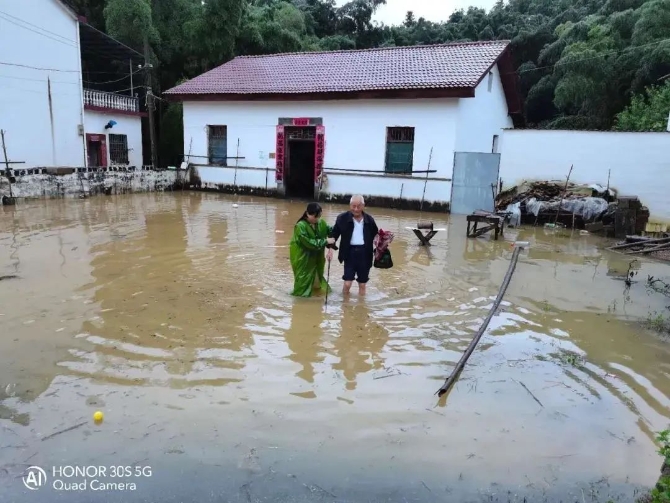 雨越下越大,水位上涨很快,道路被洪水淹没,根本分不清哪里是田地,哪里是道路,汪爱琴和一位热心村民搀扶着水花婆婆慢慢移动出来。