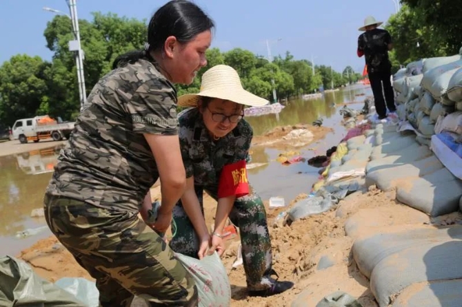 在庐山市南康镇的堤坝上,庐山市妇联主席查琴、庐山市妇联副主席于金枝、庐山市星子镇幸福村妇联主席陈阳平等妇联干部不间断巡视。一级响应后,查琴、于金枝、陈阳平三人每天要在800米堤防上来回很多趟。