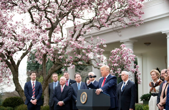 3月13日,美国总统特朗普(前)在华盛顿白宫发表讲话时正式宣布“国家紧急状态”。新华社记者 刘杰 摄