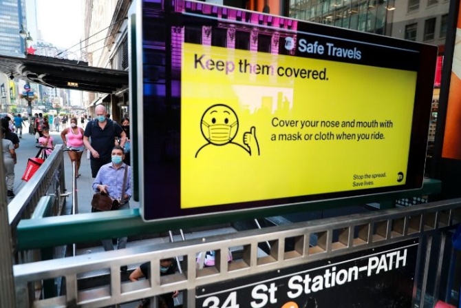 7月14日,人们佩戴口罩进入美国纽约地铁站。新华社记者王迎摄