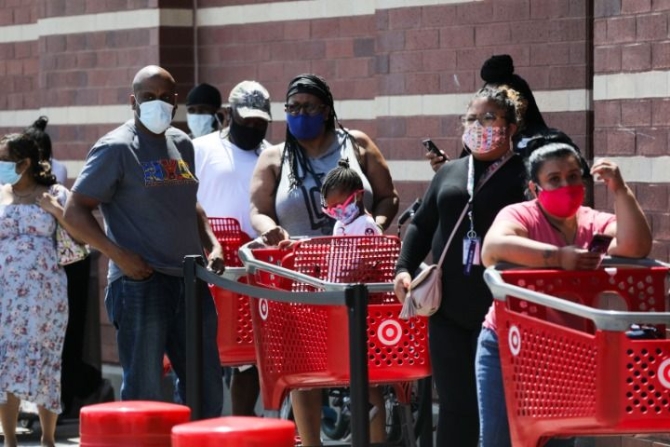 7月16日,人们在美国纽约布鲁克林一家商场外排队等待进店购物。美国约翰斯·霍普金斯大学16日发布的新冠疫情最新统计数据显示,美国累计确诊病例超过350万例。新华社记者王迎摄