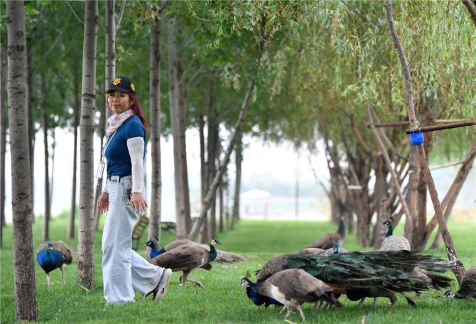 工作人员在曙光水镇内照看孔雀。(新华社记者李然摄)