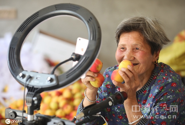 2020年5月28日,在陕西西咸新区空港新城太平镇太平堡村内,80岁的崔淑侠老人在孙子王亚楼的社区工厂里直播卖杏。王亚楼创办的社区工厂电商还在帮助贫困户的代销农产品。(图片来源:东方IC)