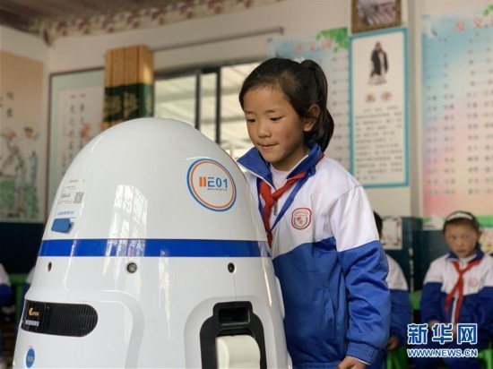 拉孜乡中心小学学生在与智能机器人对话(7月29日摄)。新华社记者 洛卓嘉措 摄