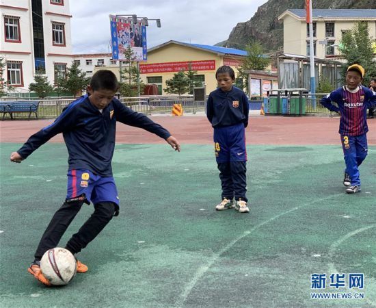 拉孜乡中心小学足球兴趣小组的学生在进行足球训练(7月29日摄)。新华社记者 洛卓嘉措 摄