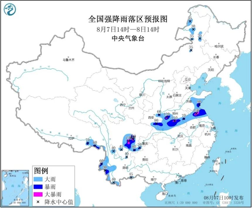 中央气象台8月7日10时继续发布暴雨黄色预警:预计,8月7日14时至8日14时,陕西东南部、湖北北部、河南南部、山东东南部、安徽北部、江苏北部、四川盆地西部和南部、云南西部、西藏东南部等地的部分地区有大到暴雨,其中,河南南部、江苏西北部、四川盆地西部等地局地有大暴雨(100~150毫米)。上述部分地区伴有短时强降水(最大小时降雨量30~50毫米,局地可超过70毫米),局地有雷暴大风等强对流天气。