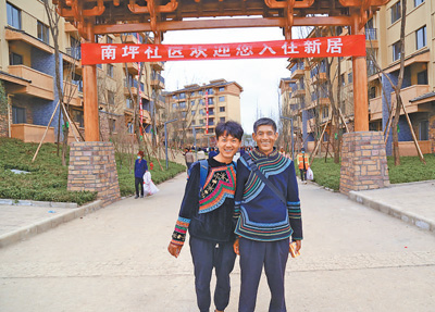 从阿土列尔村搬到南坪社区后,某色伍哈(右)和侄子在社区里合影。