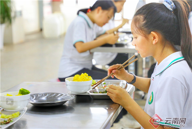 由于严格管理,食品安全检测点为食品安全上“锁”。“在学校里能吃到这样的新鲜蔬菜,我们非常满足。”正在用餐的初一年级学生彭熙烨高兴地说道。