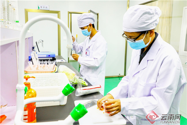 走进连万家实业有限责任公司食品安全检测点,公司工作人员正在对即将采购的蔬菜用食品安全检测系统进行农药残留、甲醛检测,并进行留样保存。