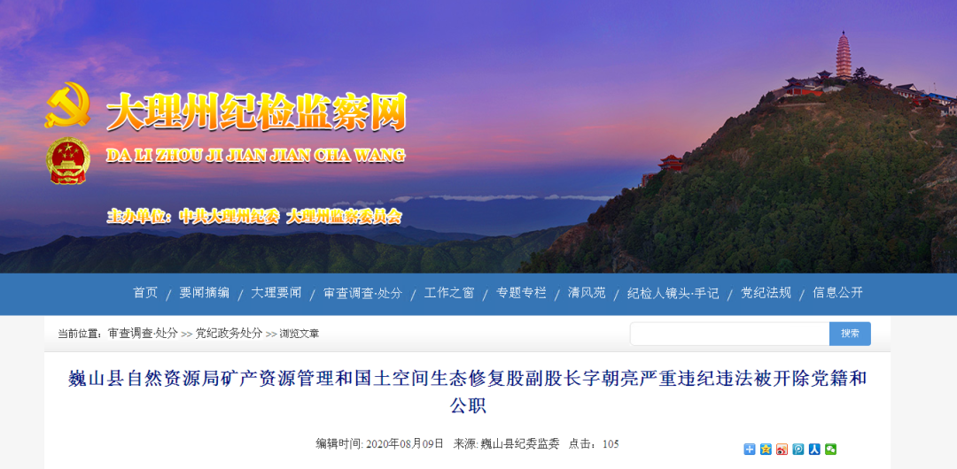 近日,据大理州纪检监察网的消息,因严重违纪违法,巍山县自然资源局矿产资源管理和国土空间生态修复股副股长字朝亮被开除党籍和公职。