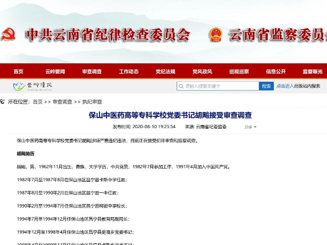 昆明信息港讯 机器人小明 保山中医药高等专科学校党委书记胡飚涉嫌严重违纪违法,目前正在接受纪律审查和监察调查。
