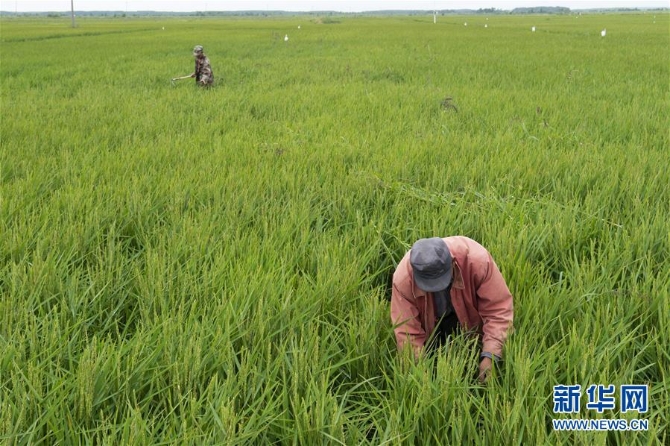 8月11日,农民在抚远市一处稻田中清除杂草。 时下,“华夏东极”黑龙江省抚远市的水稻长势良好,苍翠的稻田一望无际,犹如绿毯铺在大地上。 新华社记者 谢剑飞 摄