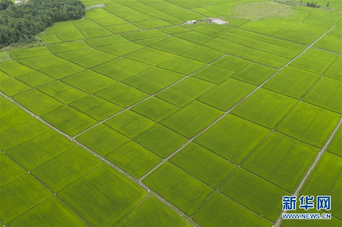 8月11日在抚远市拍摄的稻田(无人机照片)。 时下,“华夏东极”黑龙江省抚远市的水稻长势良好,苍翠的稻田一望无际,犹如绿毯铺在大地上。 新华社记者 谢剑飞 摄