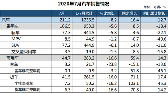 其中,7月乘用车产销分别完成172.9万辆和166.5万辆,环比下降3.9%和5.6%,同比增长13.2%和8.5%。4类细分车型产量全部增长,销量中仅MPV同比下降,其他车型均呈现增长。