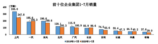 整体来看,我国汽车行业仍呈现两极分化态势,重点企业集团市场集中度高于去年同期。1-7月,汽车销量排名前十位的企业集团销量合计为1103.6万辆,同比下降12.3%,低于行业降幅0.4个百分点;占汽车销售总量的89.3%,高于去年同期0.4个百分点。