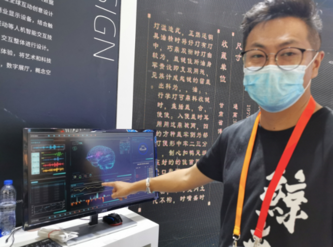 “这是基于脑波数据采集分析的沉浸式意念交互新技术,运用人工智能、大数据等技术‘锁定’人的专注度,从而控制屏幕,开启一个新的人机接口方式。利用这种3D交互手段陈列的艺术品,可给参观者带来不一样的观赏体验。”北京鲸世科技总经理吴源介绍说。只见展示大屏幕上一个静态的三彩釉陶载乐骆驼俑,随着参观者注意力的高涨,瞬间“活起来”,几个俑人一个个从驼背上跃起。
