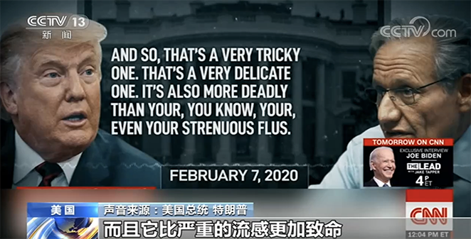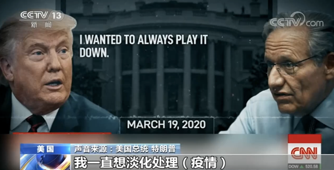 在疫情初期,也是控制疫情最关键的时候,美国政府曾多次发布“新冠并不危险”“新冠会自己消失”等言论。但美国记者鲍勃·伍德沃德在他的新书中透露,他曾在2019年12月到2020年7月之间采访过特朗普十几次,他说特朗普在新冠问题上公开和私下里的态度截然相反。尤其是在今年2月和3月的两次采访中,特朗普承认他知道疫情的严重性,只是在刻意淡化。这两段采访录音一经曝光,引发舆论一片哗然。