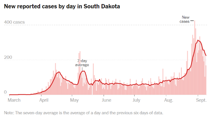 其他方面的数据也从侧面印证了摩托大会是一起“超级传播事件”。在这次大会结束不到两周之后,中西部地区的新冠确诊病例激增,尤其是南达科他州的病例两周内增加了126%。