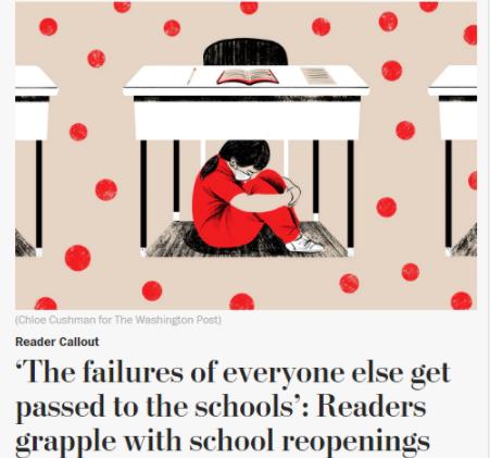 △《华盛顿邮报》9日在评论版头条位置以“其他人抗疫失败却让学校承受压力”为题,报道了老师和家长们对政府复课计划的不满。