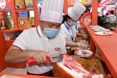 展会上厨师正在切帕尔玛火腿。新华社记者李紫恒摄