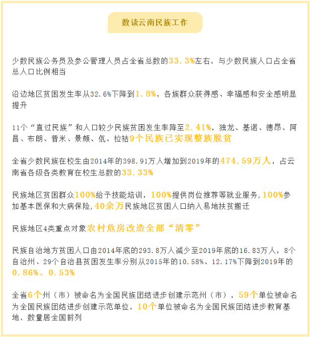 此外,出台加快发展民族教育的实施意见、教育进迪庆州三年行动计划等系列政策举措,推进民族教育事业加速发展,全省少数民族在校生由2014年的398.91万人增加到2019年的474.59万人,占云南省各级各类教育在校生总数的33.33%。大力实施培训就业工程,对民族地区贫困群众100%给予技能培训,100%提供岗位推荐等就业服务。全面建立基本医保、大病保险、医疗救助、医疗费用兜底“四重保障”,民族地区贫困群众100%参加基本医保和大病保险。始终把民族地区作为全省易地扶贫搬迁的重要战场,将符合条件的40余万民族地区贫困人口纳入易地扶贫搬迁。统筹危房改造与人居环境改善,民族地区4类重点对象农村危房改造全部“清零”。