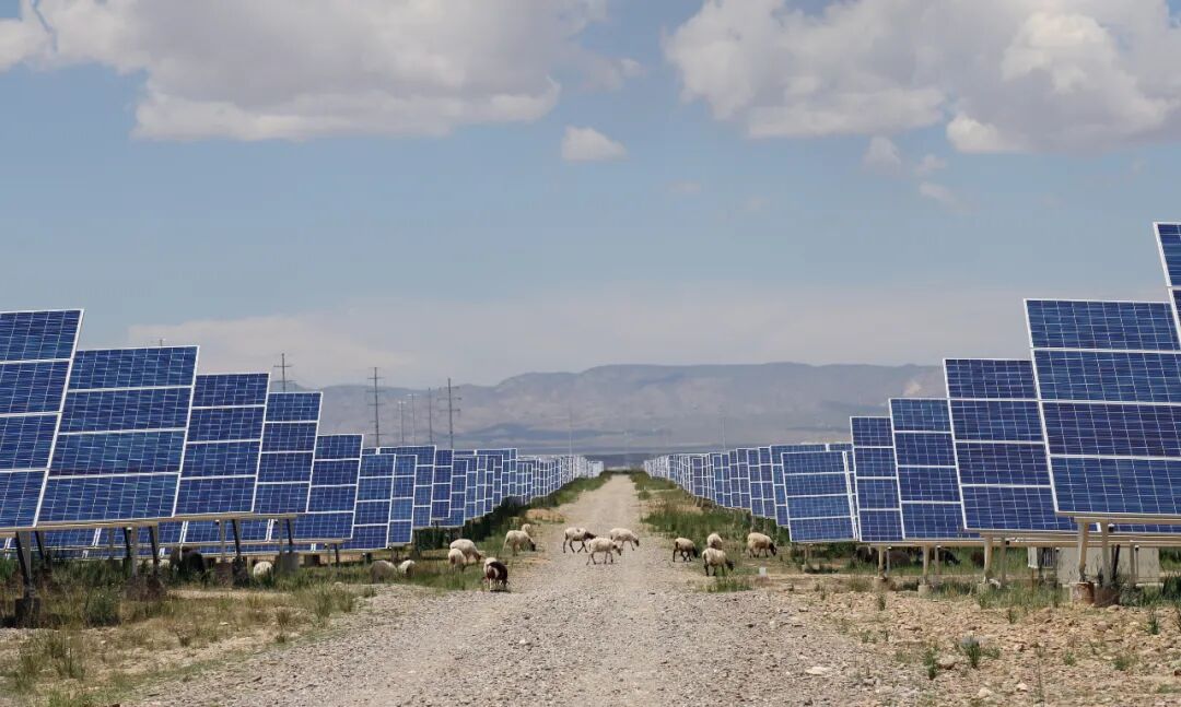 青海省海南藏族自治州共和光伏产业园区光伏基地的“光伏羊”。黄河上游水电开发有限责任公司提供。