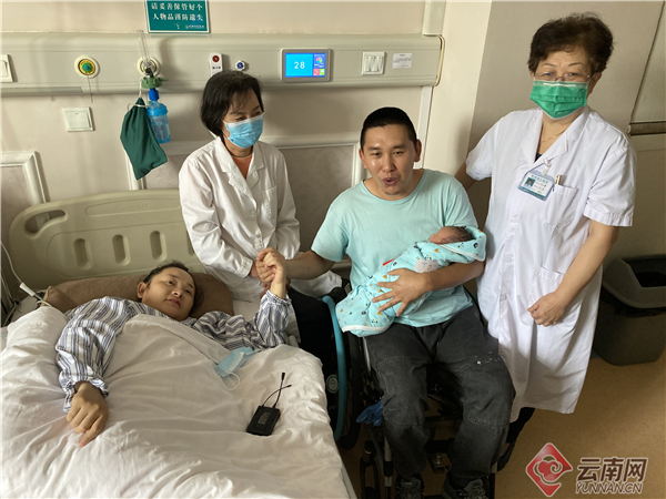 9月15日,在昆明同仁医院产科病房,赵泉洲坐在轮椅上,抱着刚出生的孩子,笑得合不拢嘴,一旁,他的妻子韩雪躺在床上看着父女俩,眼神充满了爱意。