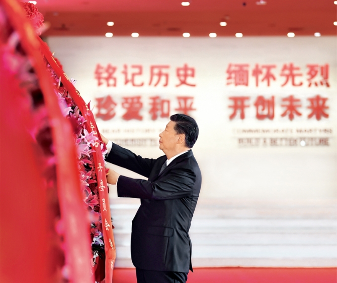 2020年9月3日上午,习近平、李克强、栗战书、汪洋、王沪宁、赵乐际、韩正、王岐山等党和国家领导人来到中国人民抗日战争纪念馆,出席纪念中国人民抗日战争暨世界反法西斯战争胜利75周年向抗战烈士敬献花篮仪式。这是习近平整理花篮上的缎带。 新华社记者 谢环驰/摄