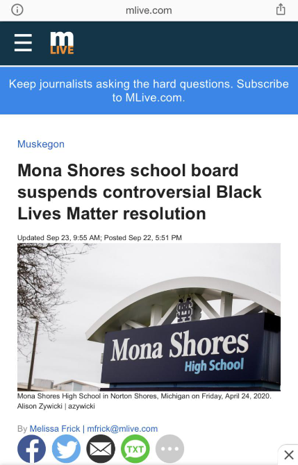 9月23日,美国密歇根州诺顿湾的莫娜海湾高中暂停了该校对BLM(Black Lives Matter)运动和黑人问题的相关教学