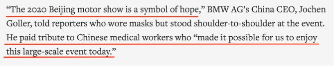 宝马集团中国区总裁兼首席执行官高乐(Jochen Goller)表示,2020年北京国际车展是希望的象征。他还对中国医务工作者致以敬意:“是他们让我们有机会参与这样的大型活动。”