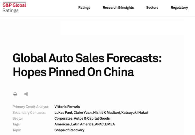近日,标普预测称,今年全球汽车销量将下降20%左右,两年后的销量仍将比2019年的销量低6%。