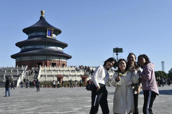 游人在北京天坛公园内自拍(10月4日摄)新华社记者 鲁鹏/摄