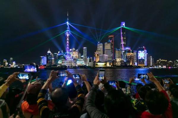 10月5日,人们在上海外滩观赏灯光秀。新华社记者 王翔/摄