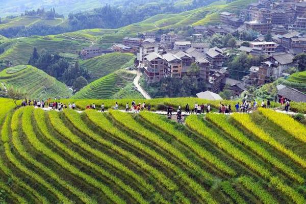 10月3日,游客在广西龙胜各族自治县龙脊梯田景区观光游玩。新华社发(吴生斌/摄)