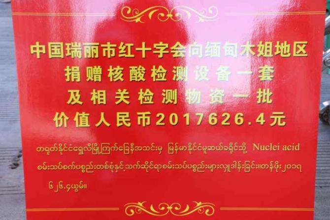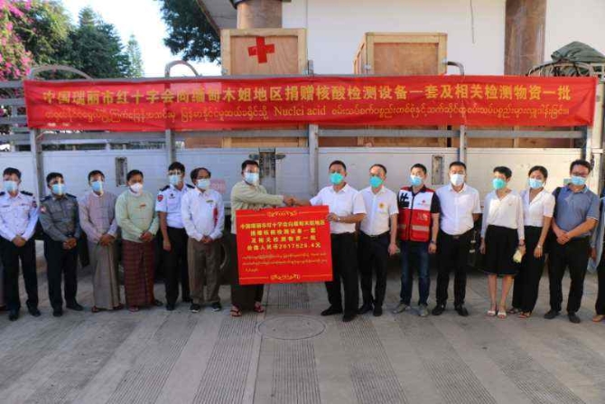瑞丽市市长谢大鹏和木姐地区副行政长官吴欧嘎,双方外事、红十字会、卫健、疾控等相关部门负责人参加捐赠仪式。据了解,为使这批捐赠物资能尽快有效地发挥作用,瑞丽市派出了由4名技术人员和检测专家组成的援助队伍,赴缅甸木姐协助安装调试设备并对缅方人员进行核酸检测培训。